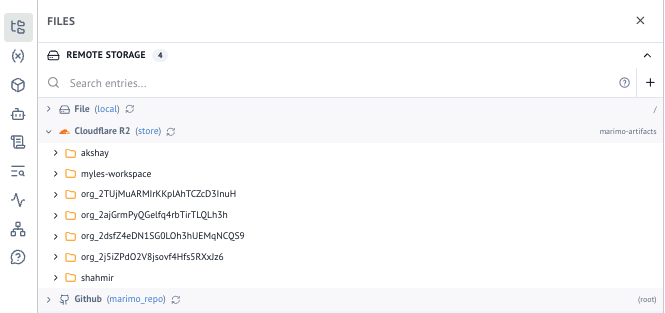 marimo now makes it easy to work with cloud storage and remote filesystems by automatically detecting obstore and fsspec storage connections in your notebook. From the Files panel, you can browse directories, search entries, copy URLs, and download files without leaving the editor. Read the docs to learn more.