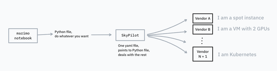 sky launch -c my-cluster --infra gcp --gpus V100:1 --cpus 16 --memory 32Once the cluster exists, we can use it to run our marimo notebook. We have two options to do so: